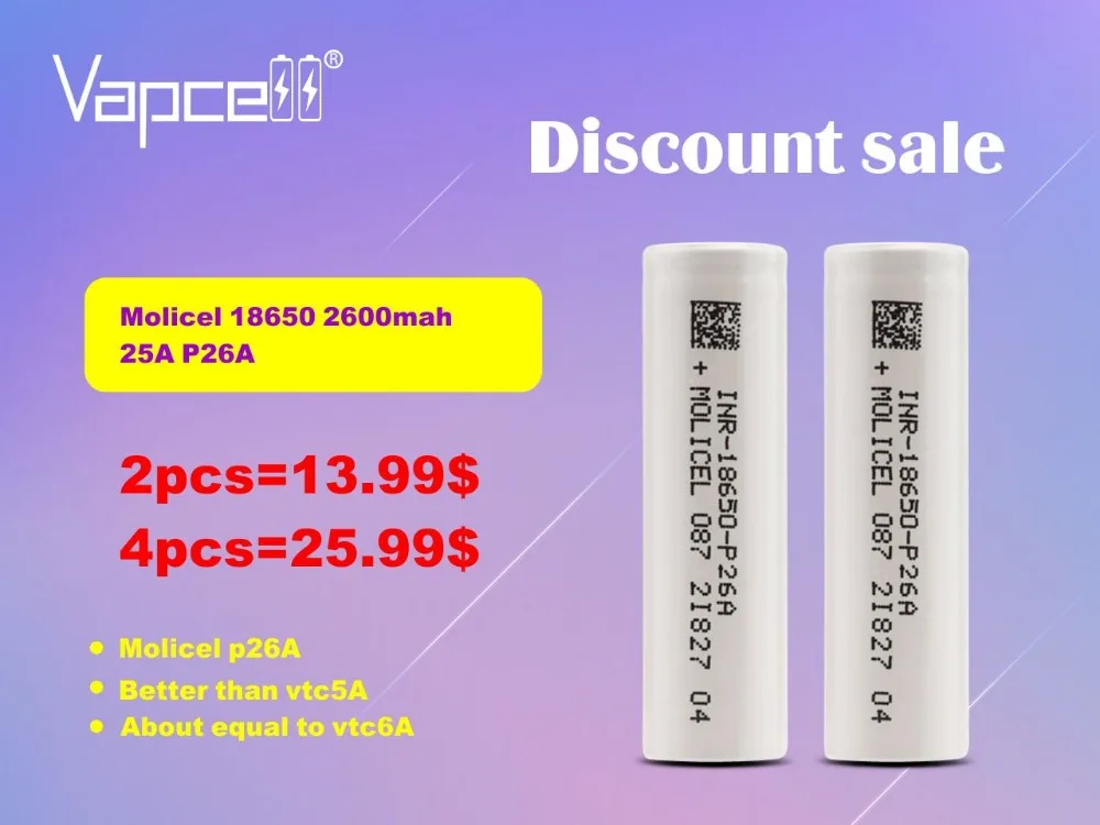 Which is the best molicel 18650 battery to buy? I can't believe i bought 18650 lithium ion batteries elsewhere. While the sony vtc5a and samsung 25s hit a little harder at the start the p26a catches up soon and runs for longer than the vtc5a. What's the maximum current rating of the molicel p26a? We don't have to worry about getting low grade, counterfeit, or old cells and molicel is willing to sell to the vaping community.